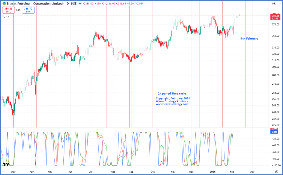 On the above chart, it can be observed that BPCL has made a low almost every time it has approached the 24 period Time cycle. The most recent low was made near the cycle which was due on 16th January 2026 and the stock has rallied more than 12% from it within a month which indicates the importance of the cycle. The next cycle is due on 19th February 2026 and a short-term low is expected to form near the cycle zone.