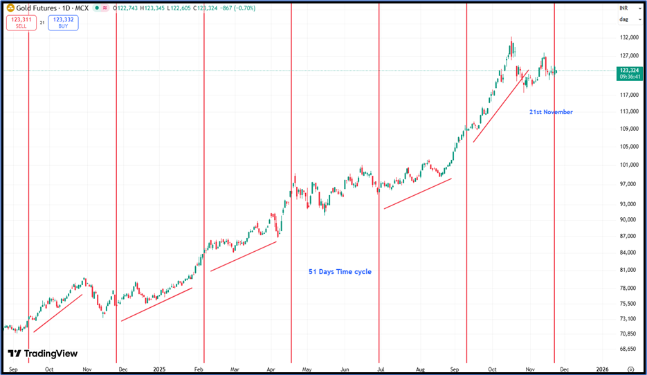 51 Days’ Time cycle: Gold on the daily chart continue to respect the 51-day Time Cycle exceptionally well. Each cycle low has acted as a key turning point, triggering a fresh leg of rally and maintaining the broader structural uptrend. Over the past several months, price consistently formed higher lows around each cycle date, confirming strong buying interest and validating the reliability of the 51-day rhythm. The rising swing lows highlighted on the chart shows that every cycle completion has resulted in bullish follow through. The 51 Days’ Time cycle: Gold on the daily chart continue to respect the 51-day Time Cycle exceptionally well. Each cycle low has acted as a key turning point, triggering a fresh leg of rally and maintaining the broader structural uptrend.