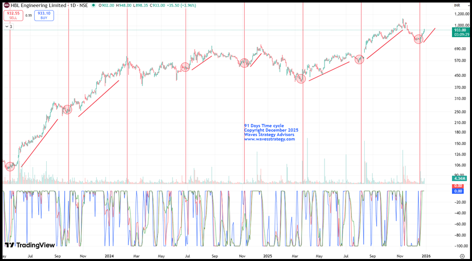 The 91-period Time Cycle has worked remarkably well on the daily timeframe of HBLENGINE. Each time prices have approached the cycle zone, the stock has shown a meaningful upside reaction. These reversal points, highlighted by the red circles, reinforce the reliability of time cycles in identifying potential lows and early trend changes.