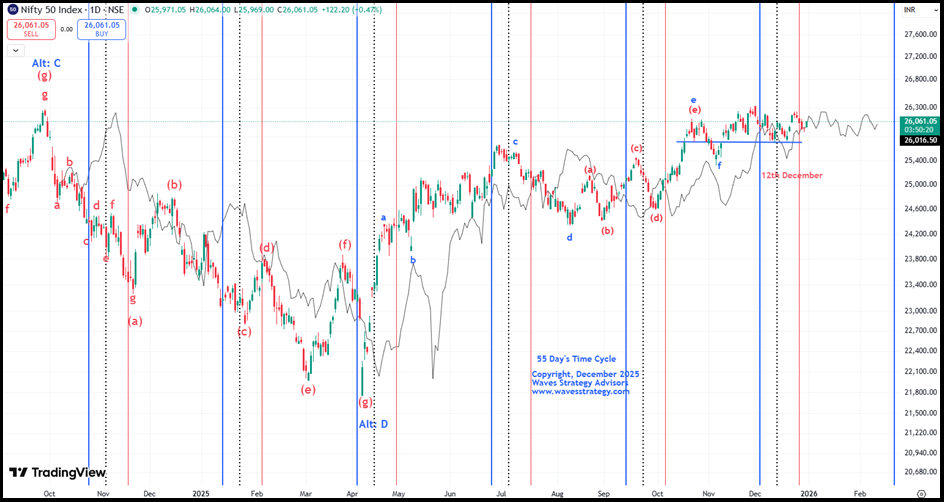 From a time-cycle standpoint, the FLD (Future Line of Demarcation)—a critical time-based indicator derived from the 55-day time cycle—provides important-looking support and resistance cues. Prices have formed a low near the cycle period itself, which occurred on 11th December, with the low recorded around 25,693.