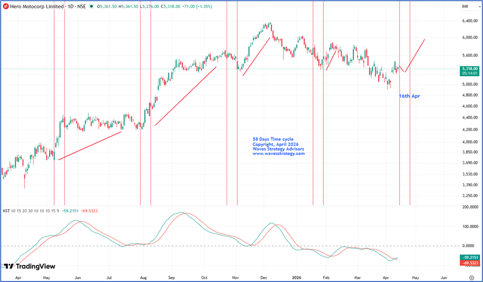 - On the daily chart of Hero MotoCorp, the 58-period Time Cycle has shown strong historical accuracy.