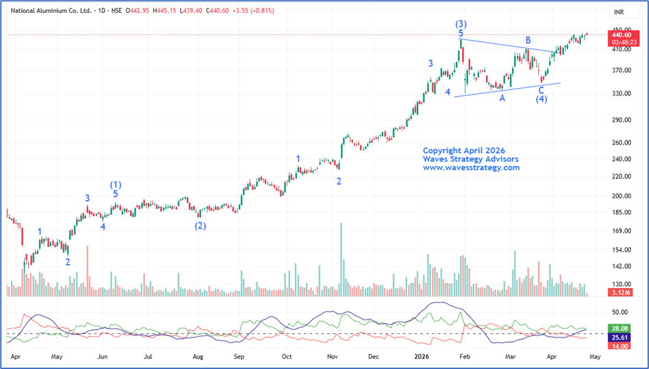 Elliott Wave analysis continues to act as a reliable guide to assess trend maturity and direction. In National Aluminium Co ltd, price action remains well aligned with its wave structure. After completing Intermediate Wave (3) in January 2026, the sideways move was in the form of wave (4) which appears to have been completed near 347 level and now the up move has begun in the form of wave (5). This phase will be most likely the last phase of buying.