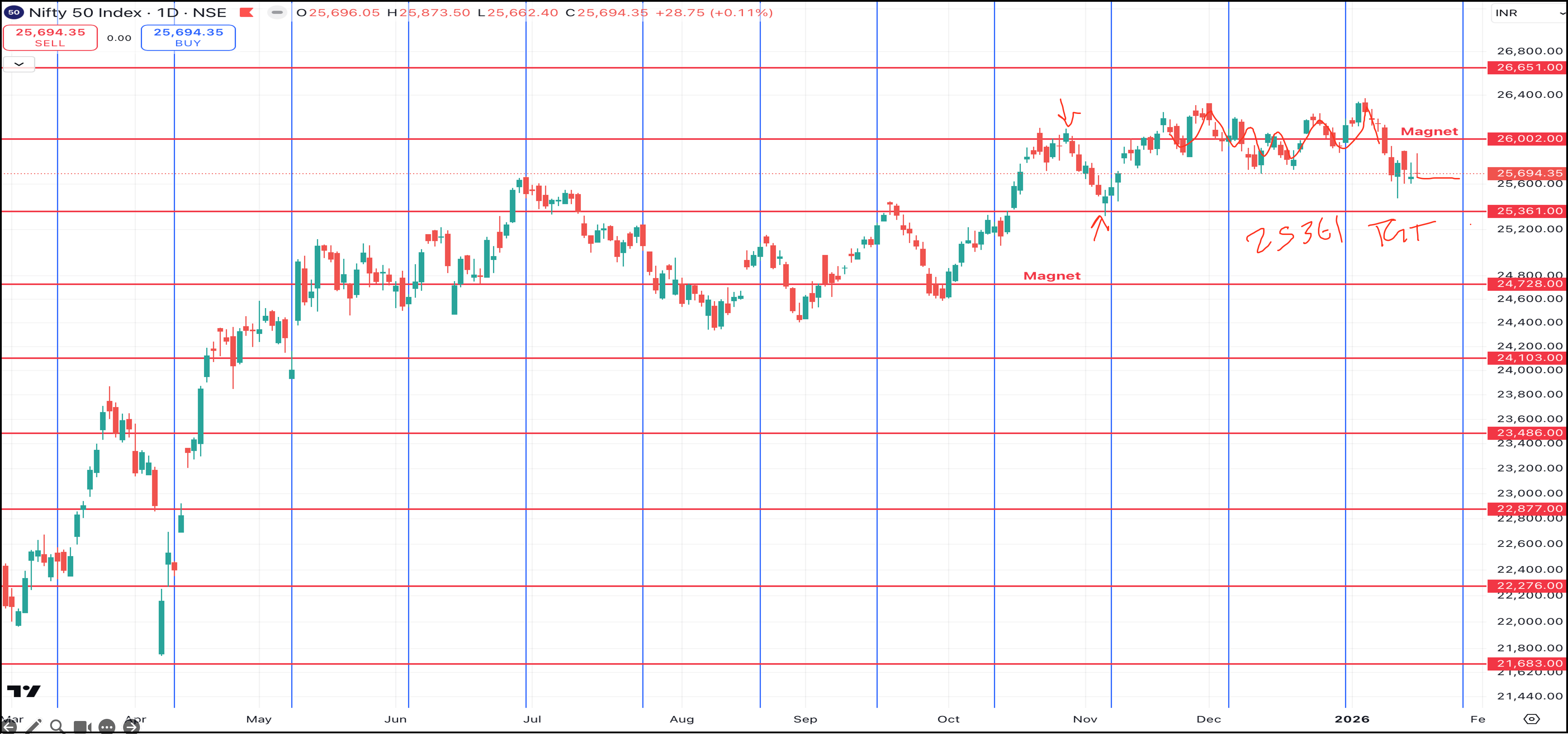 With 25,361 achieved, the next major downside target opens at 24,728, another crucial level derived from the Gann Square of 9.