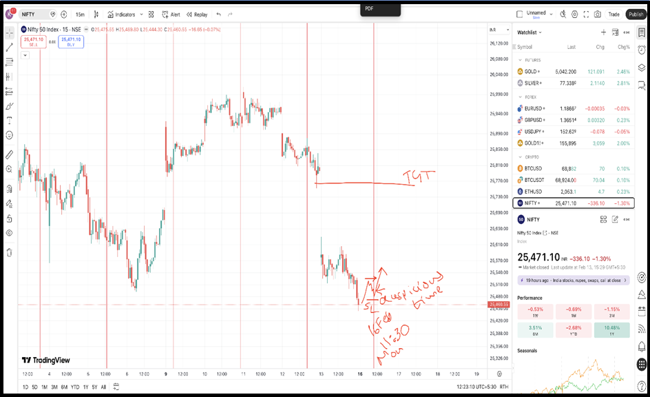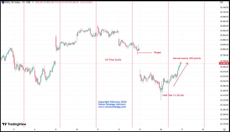 The 43-period cycle was due on 16th February 2026 at 11:30 AM, and Bang on! the index bottomed near the 25500 level almost precisely at that time. Post this Nifty staged a sharp pullback of over 190 points within a single session, highlighting the power of Time Trading. This reinforces how combining Time Cycles with Price Action can help traders stay ahead of the crowd and anticipate market turns before they occur.