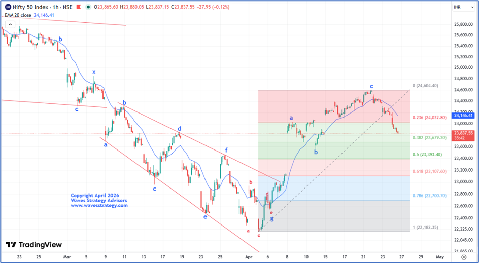 - This view remains valid as long as prices stay above the low of wave b near 23,550 levels.