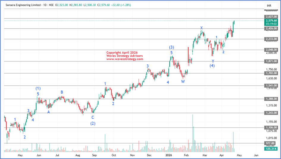 In a nutshell, the trend for Sansera Engineering is on upside as indicated by the Gann square of 9 and Elliott wave. Buy on dips is the prudent strategy to go for as long as 2426 (Gann level) stays intact on closing basis.
