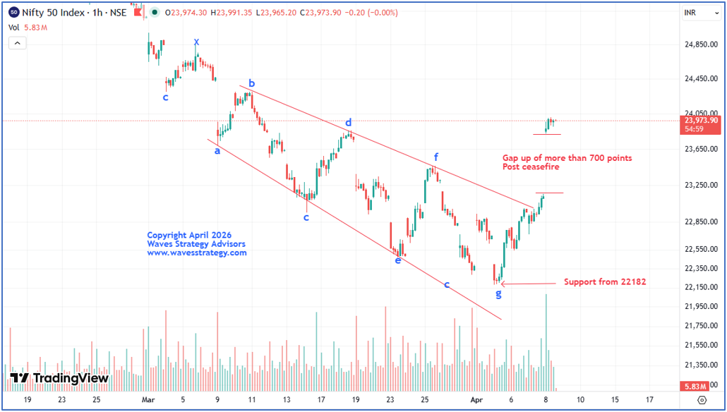 Initially, Nifty remained under pressure, eventually marking a low around 22182. From there, the index staged a sharp recovery, rallying nearly 950 points. The momentum intensified further in today’s session, where the market witnessed a massive gap-up opening of over 700 points, driven by positive global cues following the US–Israel–Iran ceasefire development.